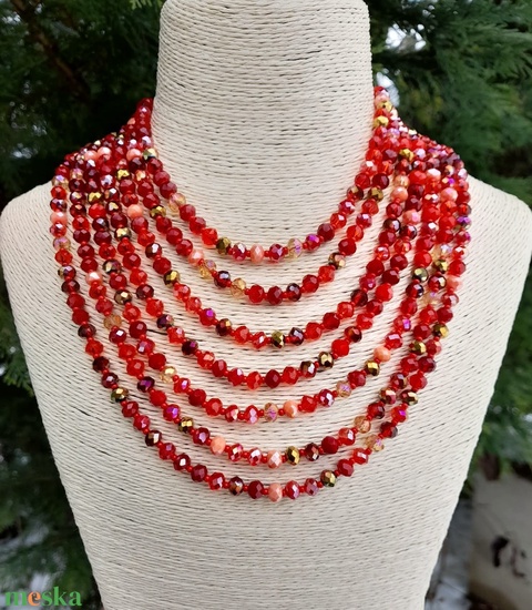 Hétsoros, piros mix csiszolt üveggyöngy kaláris, néptánckellék, néptáncos kiegészítő, népi ékszer