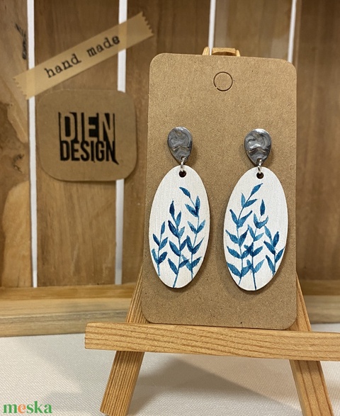 Ornamentika1 - kézzel festett ornamentikus fa fülbevaló, kék, ovális, nagy
