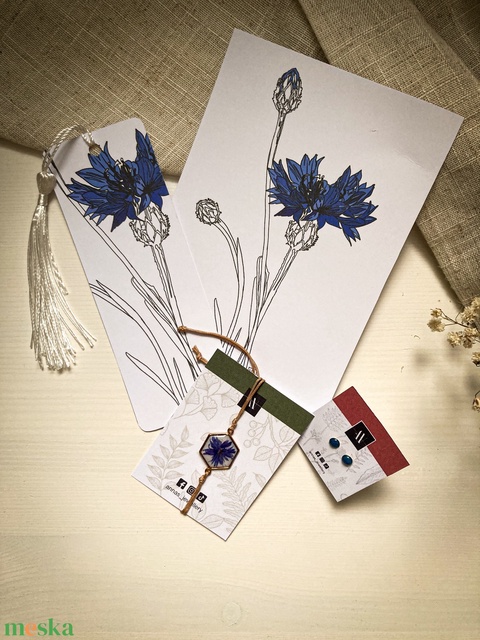Zsinórkarkötő, fülbevaló, könyvjelző - Búzavirágos szett
