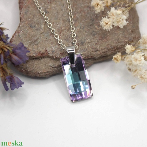 Téglalap formájú türkizesen csillanó, halvány lilás-rózsaszín Aurora kristály ezüst láncon - Üvegmetszés