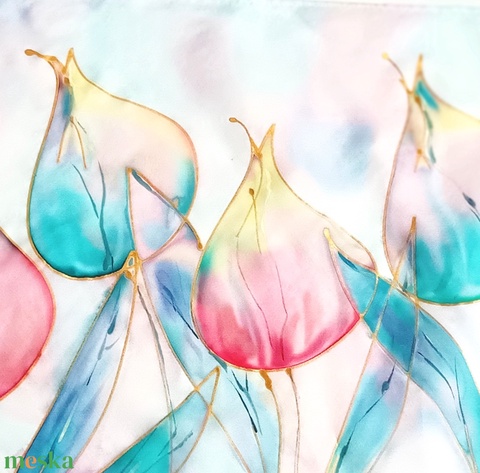 Kézzel festett, művészi és hordható sálak tiszta selyemből. Időtálló érték, természetesen.