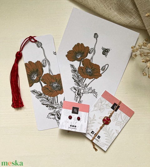 Pipacsos szett - Zsinórkarkötő, fülbevaló, könyvjelző