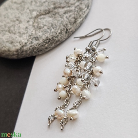 - Anyaga: nemesacél fülbevaló alap, ezüstözött lánc, tenyésztett gyöngy, hegyikristály, gyöngyház