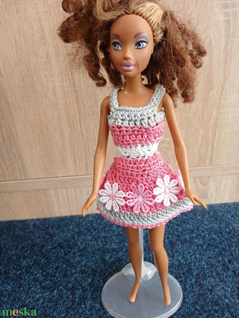 Rózsaszín horgolt Barbie ruha virágokkal.
