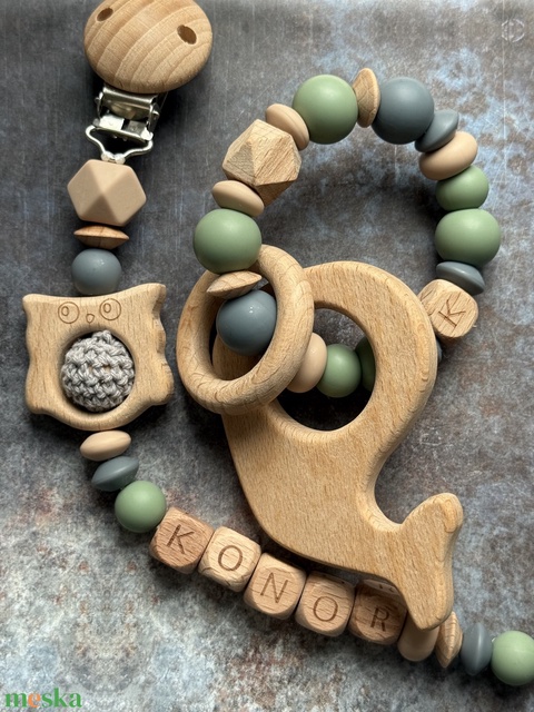 BABABOX #02 Csörgő rágóka és cumilánc Zsálya - Karamell - Antracit