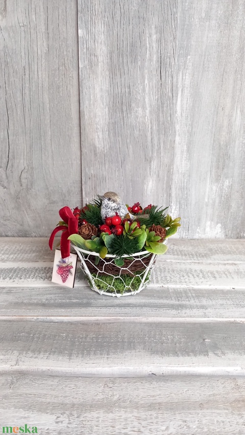 - Anyaga: szalag, műzöldek, fém-drótkosár, kismadárdekor, táblácska, vadszőlőindák, zúzmó, tobozok