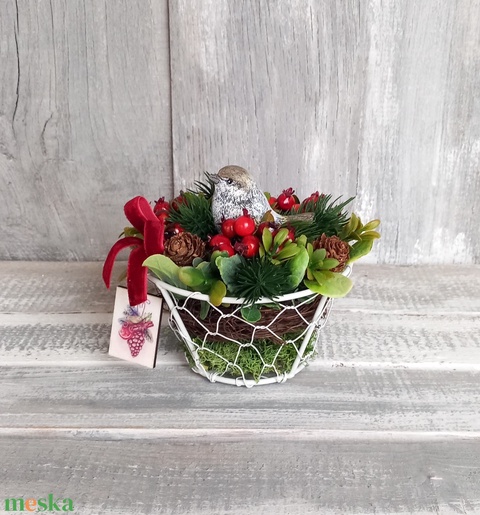- Anyag/Összetevő szalag, műzöldek, fém-drótkosár, kismadárdekor, táblácska, vadszőlőindák, zúzmó, tobozok