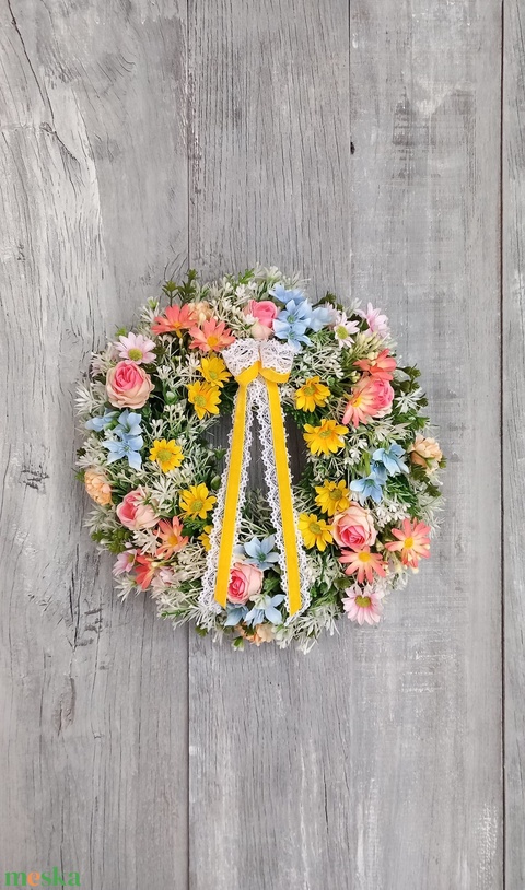 - Anyaga: szalmakoszorúalap, művirágok, műzöldek, szalagok