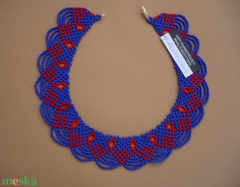 Zsűrizett! kék-piros ukrán szívecskés gyöngygallér, gyöngynyaklánc, ajándék