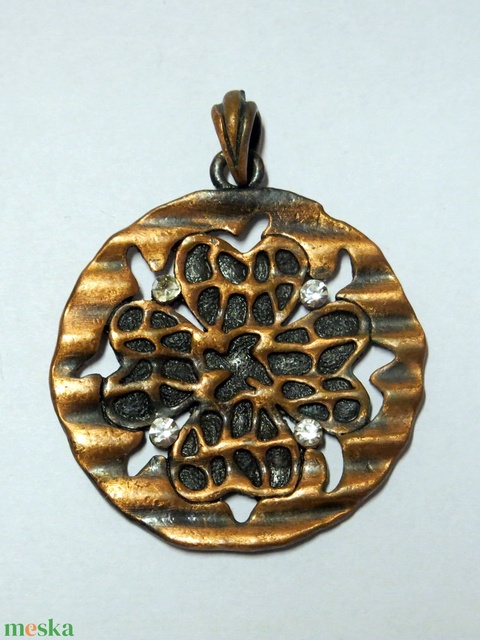 Antik kézműves nyaklánc bronz medál 41 mm áttört virágmintás kerek réz ékszer