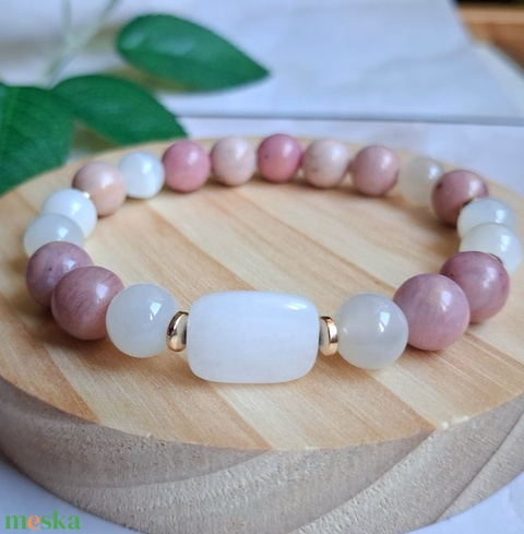 Ez a rodonitból, holdkőből és fehér jádéból készült ásvány karkötő finom, nőies kiegészítő, amely jól illik mindennapi viselethez, és ajándéknak is szép, jelentéssel bíró választás lehet.