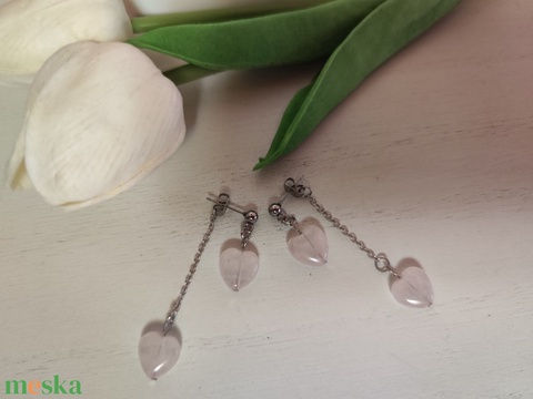 Nemesacél fülbevaló Rózsakvarc szív medállal!