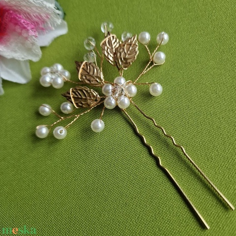 ESKÜVŐ HAD240 - Arany színű 4 leveles gyöngyös hajtű, hajdísz