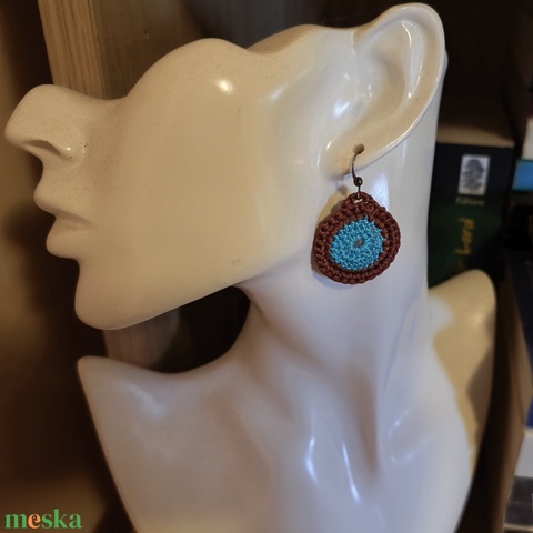 Horgolt türkiz-barna korong fülbevaló