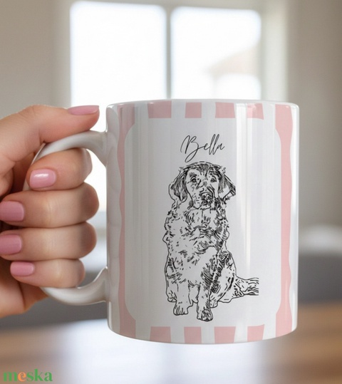 Egyedi állatos bögre saját fotóból – sketch stílusú rajz, névvel és választható háttérszínnel