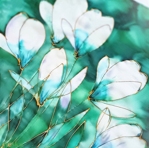 Kézzel festett, művészi és hordható sálak tiszta selyemből. Időtálló érték, természetesen.