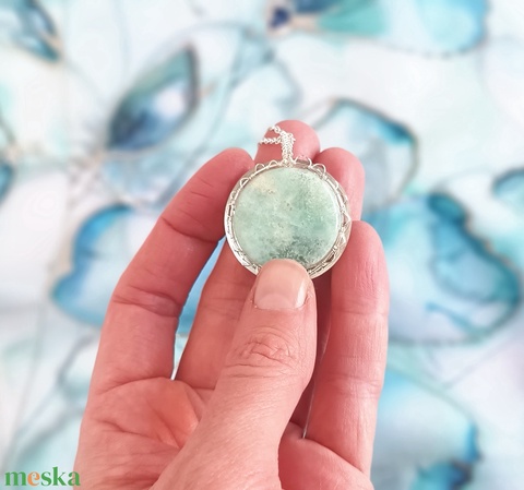 - Anyaga: hernyóselyem, hőfixált festék, ásvány gyöngyök, ásvány medál, rézdrót, papír, réz