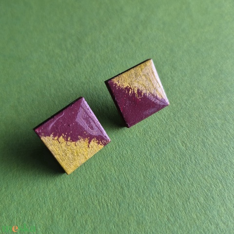 Bordó-arany négyzetes fa bedugós fülbevaló