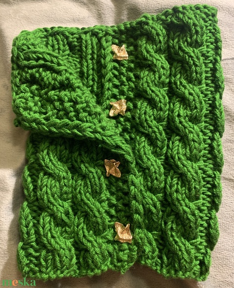 . Csavart mintás, Sál. kézi kötésű fű zöld színű gombos körsál eladó