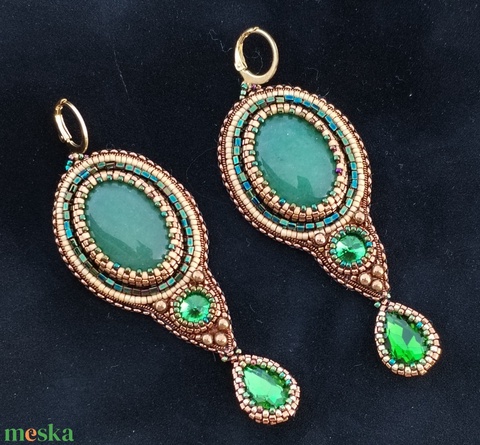- Anyaga: aventurin kaboson, zöld rivoli kristály, zöld csepp alakú kristály, japán kásagyöngy, hála. hex gyöngy, francia drót, bőr, aranyozott rozsdamentes acél fülbevaló alap