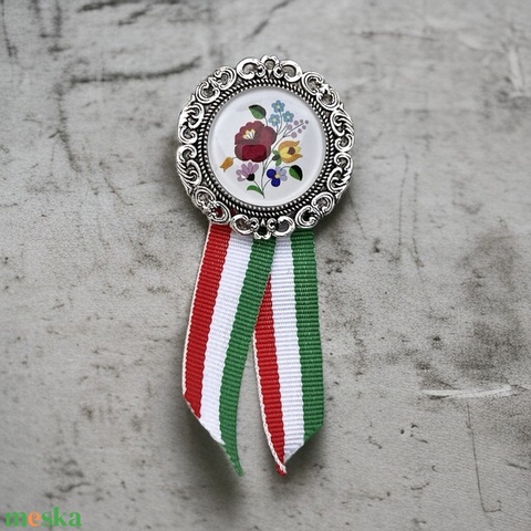 Üveglencsés kokárda kalocsai mintával ezüst 001