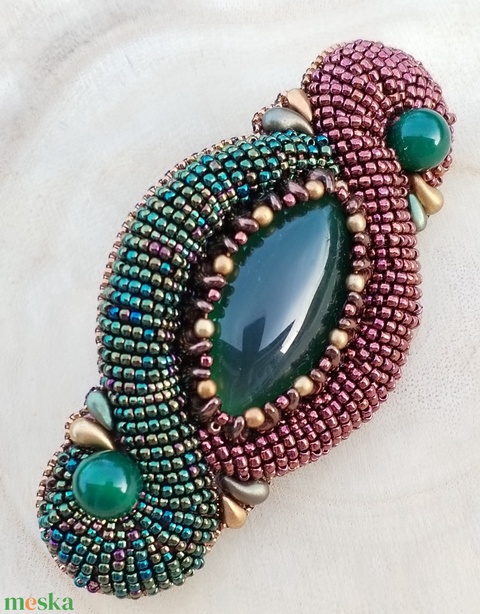 - Anyaga: jáde kaboson, jáde gyöngy, cseh formagyöngyök, japán kásagyöngyök, francia csat alap, bőr