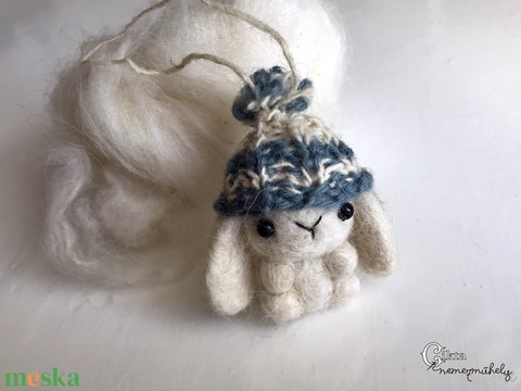 Tűnemezelt fehér nyuszi kötött sapkában