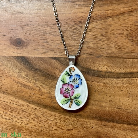Mentett porcelán darabok - virágos nyaklánc - nemesacél csepp medálos