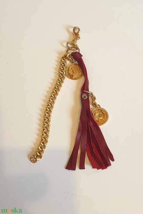 Táskadísz, piros valódi bőr, arany lánccal, pénzérmékkel. Karabineres. Egyedi, kézműves termék. Ajándéknak is