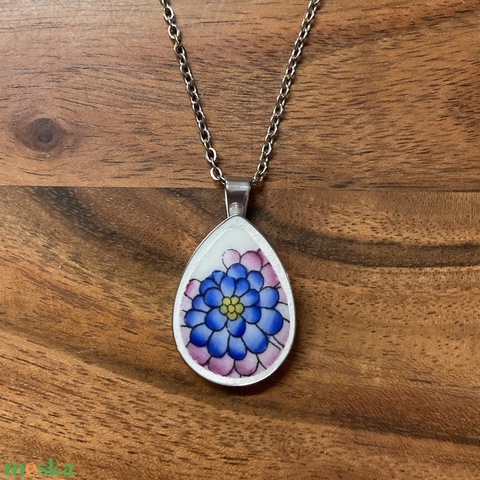 Mentett porcelán darabok - virágos nyaklánc - nemesacél csepp medálos
