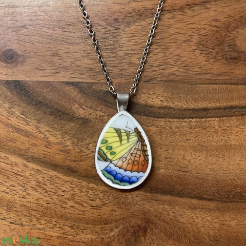 Mentett porcelán darabok - pillangós nyaklánc - nemesacél csepp medálos
