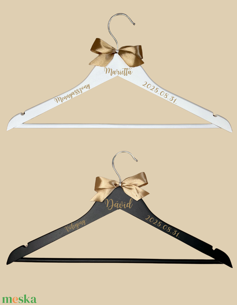 A vállfa egyik oldalán a „titulus” (a képen látható vállfa esetében menyasszony, a másik oldalára az esküvő dátuma, középre pedig egy név kerül).