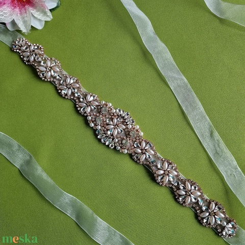 ESKÜVŐ MÖV21B - Rosegold színű strasszköves gyöngyös menyasszonyi öv 35x5 cm szalagon