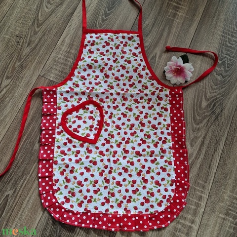 KTN01 - Eper mintás, pöttyös fodros gyerek pamut konyhai kötény és zöld pöttyös felnőtt kötény