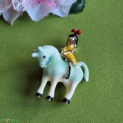 Kitűző, bross BRO158 - Tűzzománccal bevont lovagló kislány 35x48mm