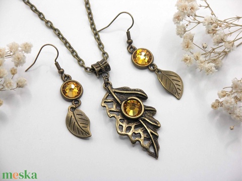 Sárgásbarna színű Preciosa kristályokkal és antik bronz levelekkel készült ékszerszett - Aurum