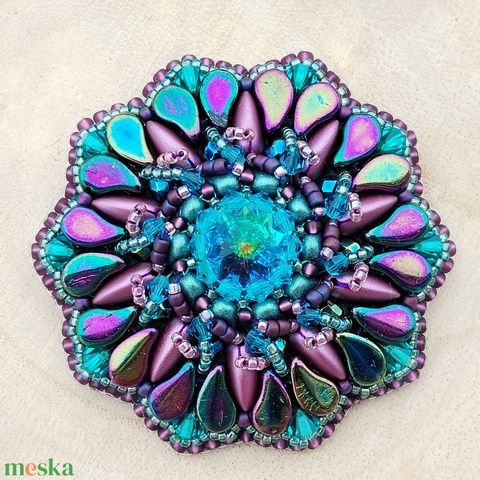 - Anyaga: matubo rivoli, paisley duo, chili bead, japán kásagyöngy, cseh csiszolt gyöngy, preciosa bicone, brossalap, ultrasuede