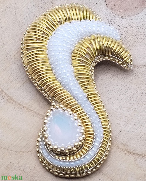 - Anyaga: kemény francia drót, puha francia drót, japán kásagyöngy, fehér opál csepp alakú kristály, brossalap, bőr
