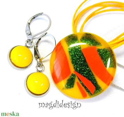 Sárga narancs zöld kontraszt üvegékszer szett nyaklánc kapcsos fülbevaló
