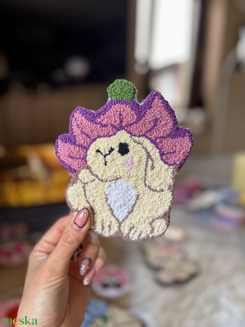 Hímzett poháralátét, virágos nyuszi