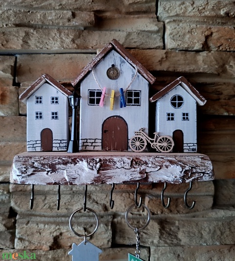 Egyedi tervezésű, fából készült fali kulcstartó házikókkal és biciklivel