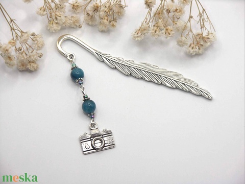 Ezüst színű, toll formájú könyvjelző sötétkék apatit ásványgyöngyökkel, fényképezőgép függővel – Insta