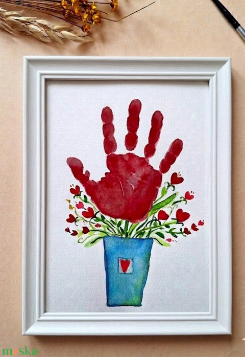 Szeretet-Virág- tenyérnyomat , Anyák napi kép, köszöntő lap kézzel festett akvarell lap Anyák, mamáknak,