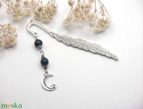 Ezüst színű, toll formájú könyvjelző sötétkék apatit ásványgyöngyökkel, Hold függővel – Lunar