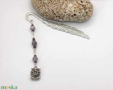 AJÁNDÉK csomagolás! Ezüst színű, toll alakú könyvjelző ametiszt ásványgyöngyökkel, bagoly alakú függővel - Tudás