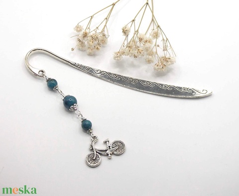 AJÁNDÉK csomagolás! Ezüst színű, íves könyvjelző sötétkék apatit ásványgyöngyökkel, kerékpár függővel – Kék bicikli