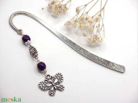 AJÁNDÉK csomagolás! Ezüst színű, virágmintás könyvjelző püspöklila cseh üveggyöngyökkel, lepke függővel – Iris