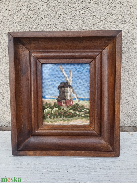 Régi, üvegezett fakeretes tűgobelin falikép_szélmalom