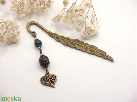 AJÁNDÉK csomagolás! Antik bronz, toll alakú könyvjelző sötétkék apatit ásványgyöngyökkel, szív alakú függővel – Amar