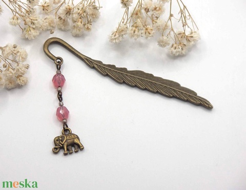 AJÁNDÉK csomagolás! Antik bronz, toll alakú könyvjelző opálos rózsaszín cseh üveggyöngyökkel, elefánt alakú függővel